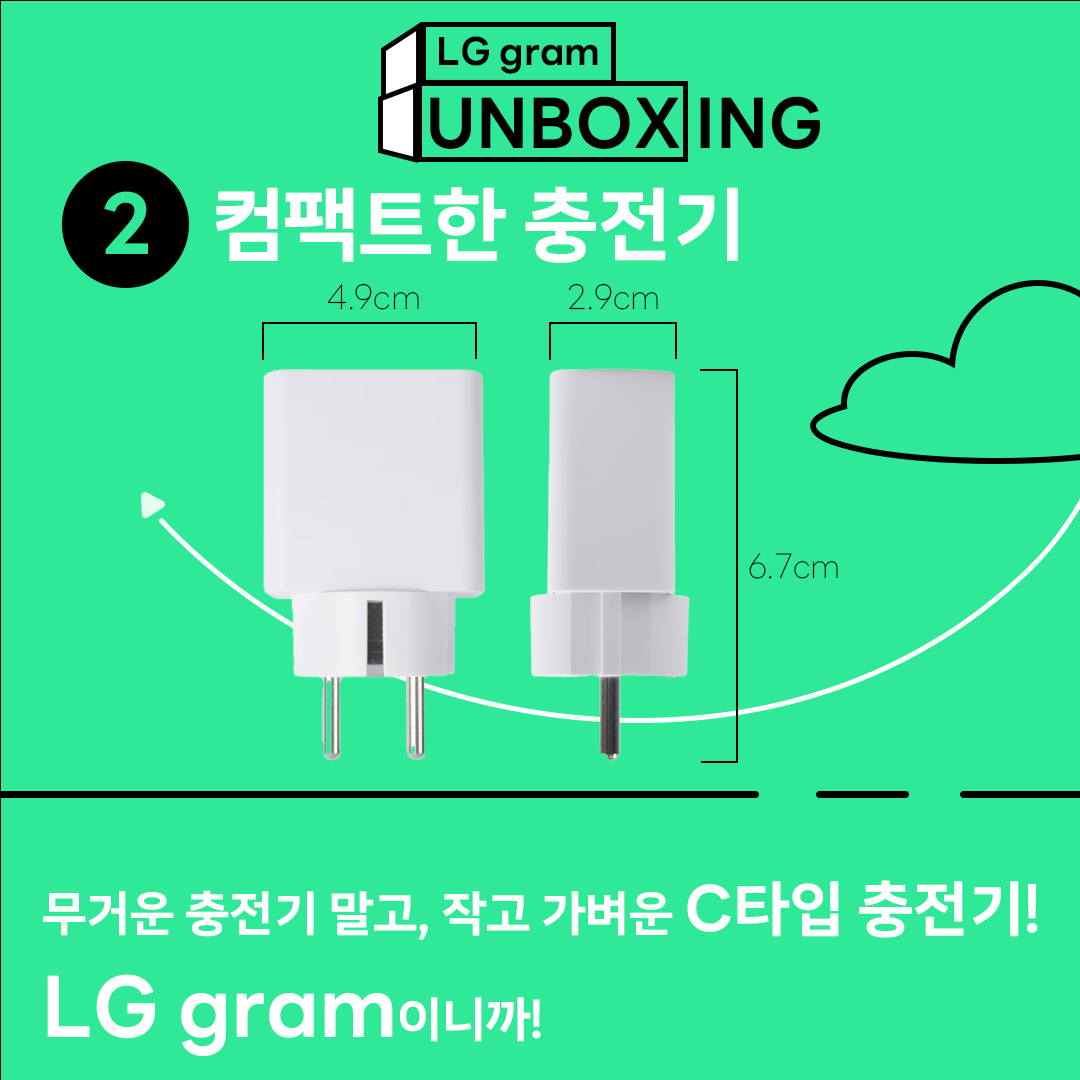 사실 대부분의 고성능 노트북 충전기는 크고 무거울 뿐만 아니라 일부 노트북은 해당 노트북이랑만 호환이 되는 연결잭을 사용하기도 합니다. 굉장히 힘들고 귀찮은 상황입니다. 하지만 제가 오늘 LG gram RTX 3050을 언박싱하면서 가장 놀랐던 점은 휴대폰 충전기 정도의 작은 충전기가 노트북 충전기라는 사실입니다.