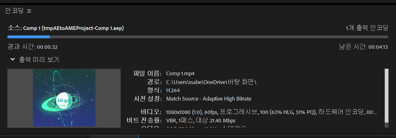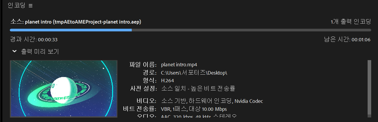 완성된 제작 영상을 Adobe Media Encoder 2023로 렌더링 하는데 걸리는 시간을 비교해보겠습니다.