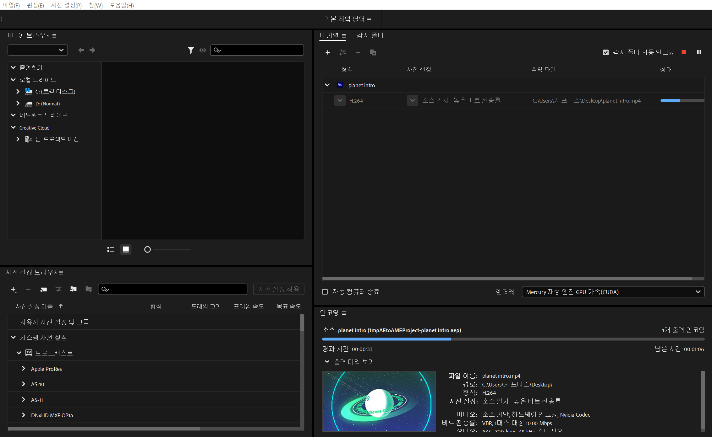 완성된 제작 영상을 Adobe Media Encoder 2023로 렌더링 하는데 걸리는 시간을 비교해보겠습니다.